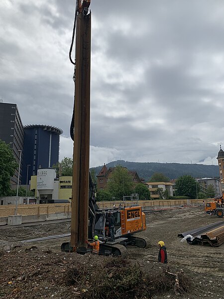 Erster Einsatz unseres werksneuen Telemäkler Trägergerät TM20 von ABI mit einem MRZV30VV Vibrator der die Spundwandprofile durch das anstehenden Inngeschiebe mit guter Rammleistung einbringt.