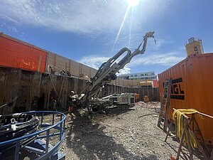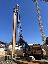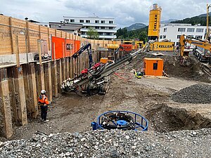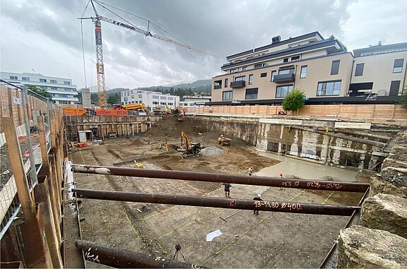 Für die rund 7 Meter tiefe Baugrube wurde eine dichte Baugrubenumschließung mittels überschnittener Bohrpfahlwände (DN 600 und DN 900) in Kombination mit einer Spundwand sowie einer Dichtsohle hergestellt. Die Rückverankerung erfolgte durch innenliegende Aussteifung und temporäre Litzenverpressanker.