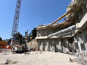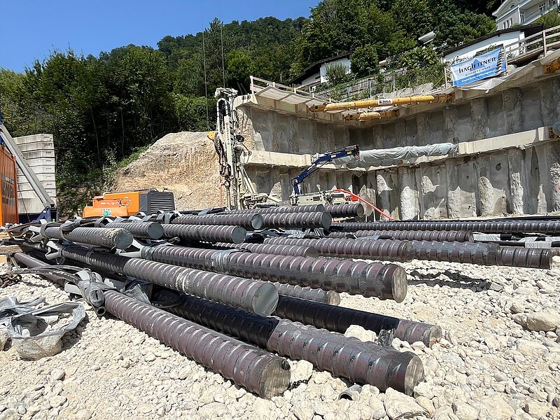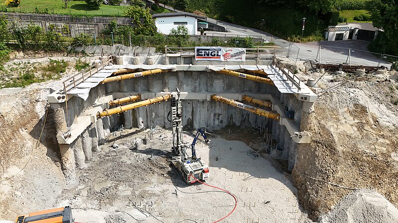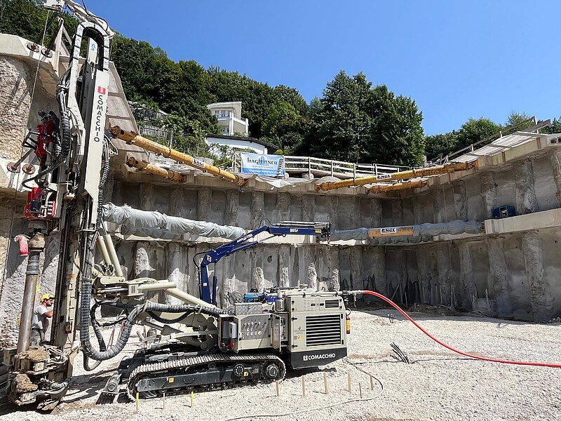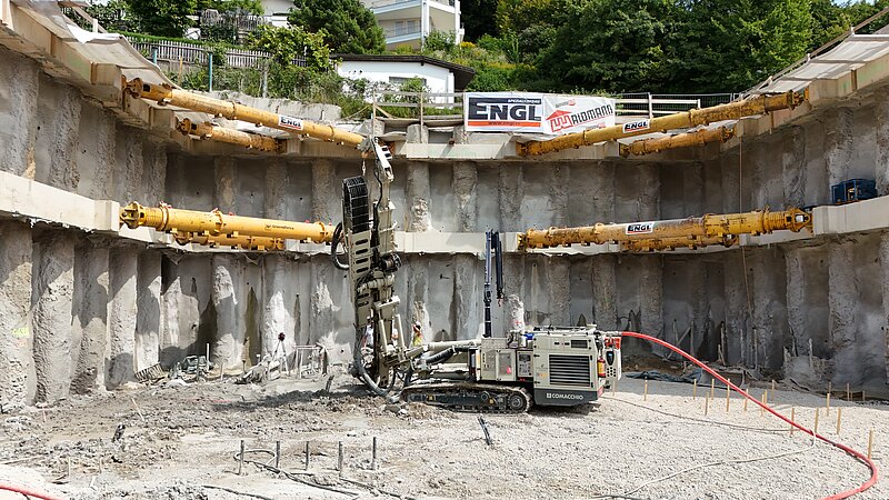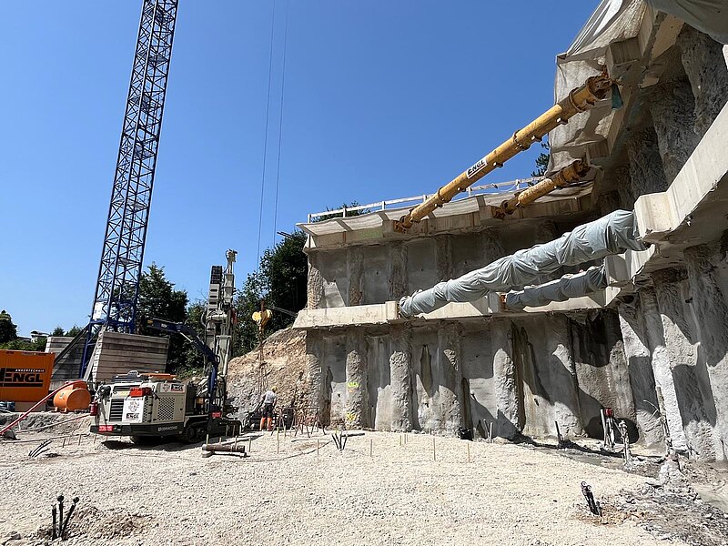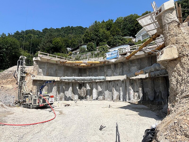 Aufgrund der ausgeprägten Hanglage und der unmittelbaren Nähe zu bestehender Bebauung war ein besonders verformungsarmes Sicherungssystem erforderlich. Die Baugrubensicherung wurde als aufgelöste Pfahlwand mit Pfählen DN 900 und Spritzbetonausfachung ausgeführt. Zur Aussteifung kamen Stahlbeton-Ankerbalken in zwei Ebenen mit vorgespannten Aussteifungsrohren zum Einsatz. Zusätzlich wurden Litzenanker zur Aufnahme der Horizontalkräfte und deren Ableitung in den Baugrund hergestellt. Zur dauerhaften Sicherung des Neubaus gegen Hangdruck wurden GEWI-Anker DN 50 bis 63,5 ausgeführt.