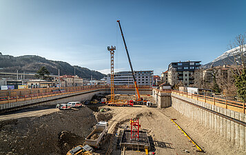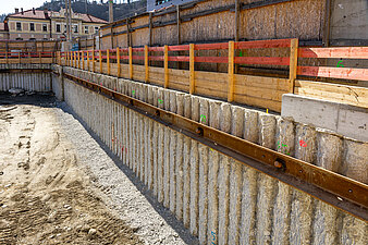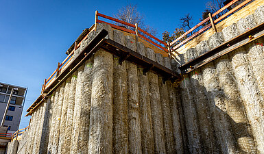 Mit 3 Drehbohranlagen konnten wir in Rekordzeit von nur 4 Wochen die gesamten Pfahlarbeiten, umfassend von 506 Pfählen ( Durchmesser 620-1200) fertigstellen. Neben den Verpressankern konnten auch die Erdarbeiten innerhalb der Vorgaben des engen Ablaufplanes, trotz winterlicher Verhältnisse erfolgreich abgewickelt werden.
